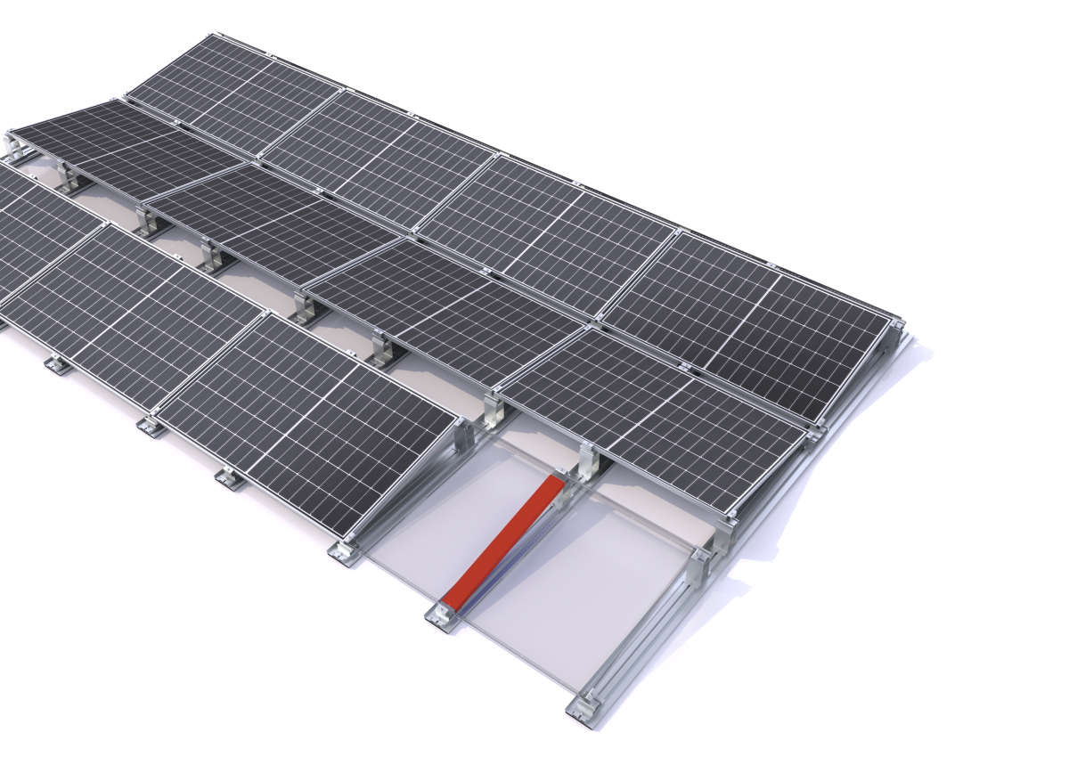 Proporciona estabilidad adicional con soportes y sujeción en el módulo. Ventajas: Favorece la distribución de la carga, reduce la presión superficial sobre el aislamiento, aumenta la capacidad de carga y la resistencia a las cargas de viento y nieve. Ventaja de seguridad para módulos más grandes y condiciones de tejado exigentes.